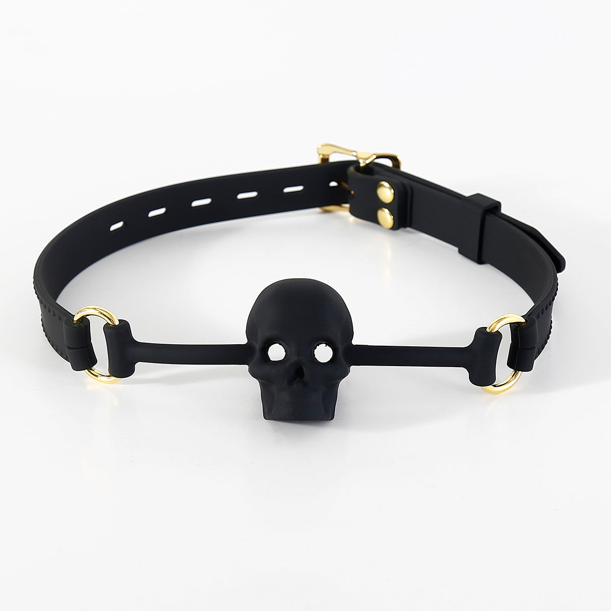 The bold, black skull design adds a sinister allure to your play, offering a thrilling visual impact. Whether you're seeking to indulge in a bit of darkness or to ignite passion with a twist of rebellion, this gag delivers the perfect combination of seduction and mystery.